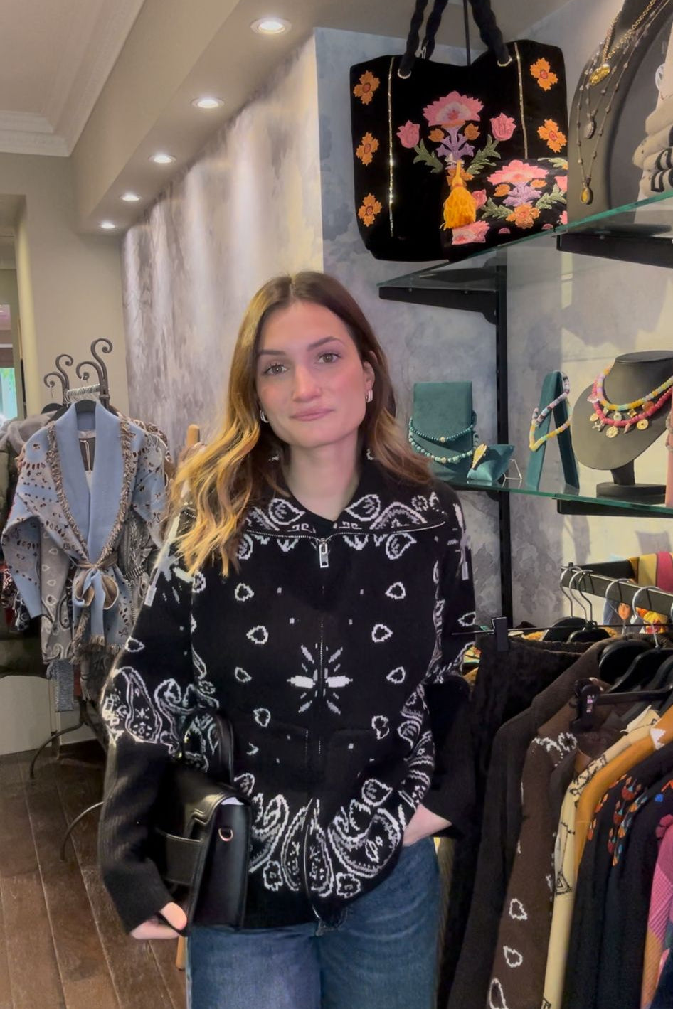 Its thick and cozy knit offers reassuring warmth for autumn, while the bandana print brings a free-spirited, folk-inspired Western vibe.