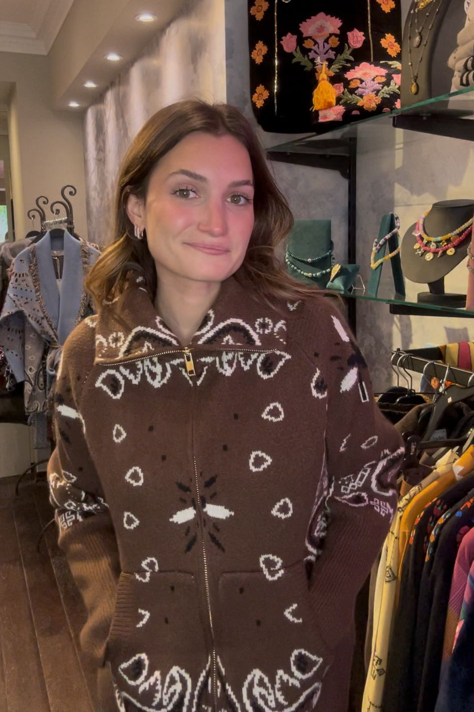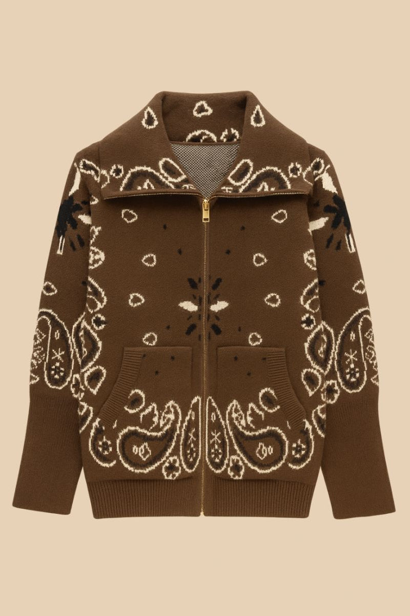 Its thick and cozy knit offers reassuring warmth for autumn, while the bandana print brings a free-spirited, folk-inspired Western vibe.