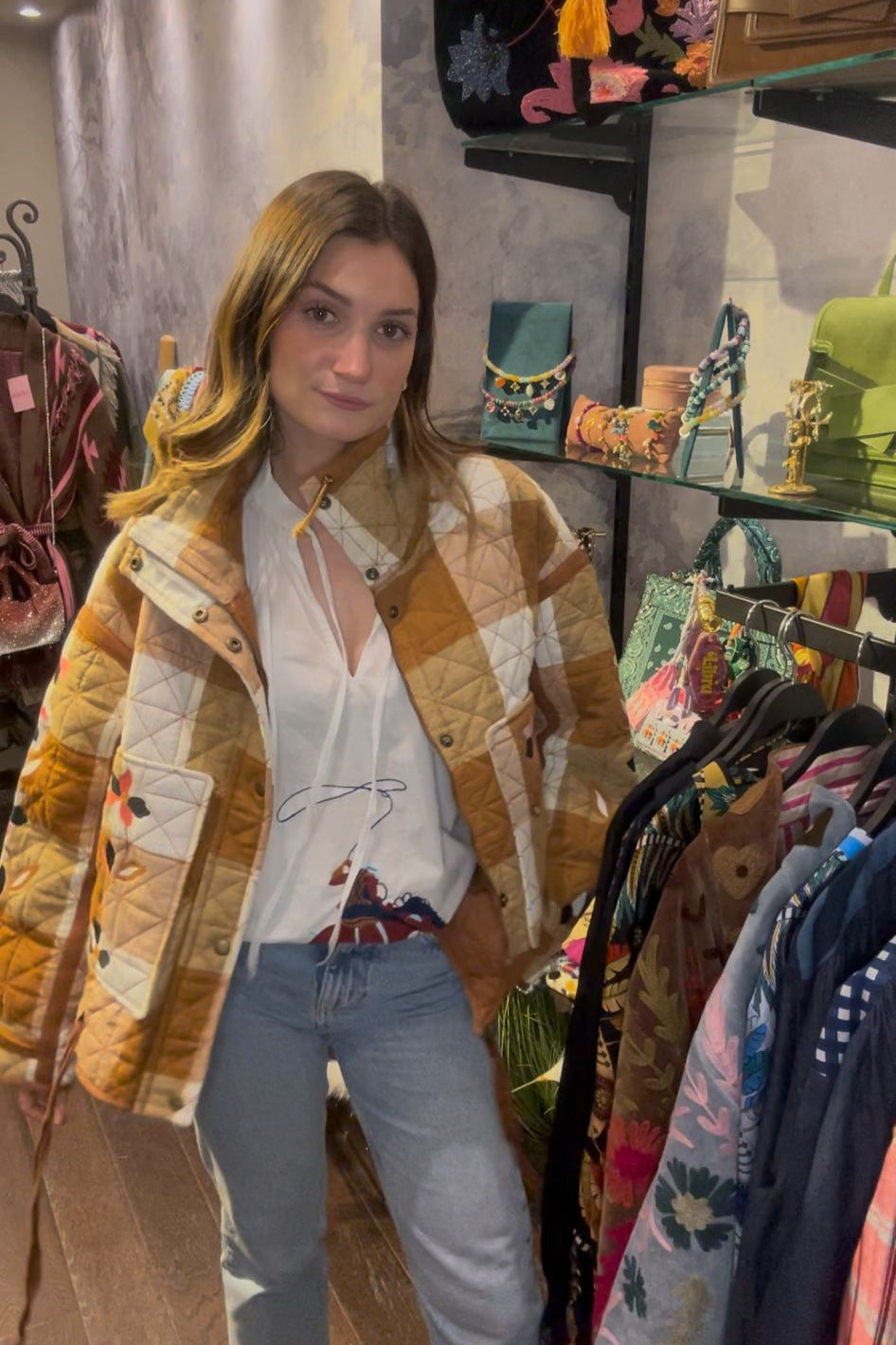 Its patchwork in warm caramel tones and its delicate floral embroidery give it a charm that is both vintage and playful.