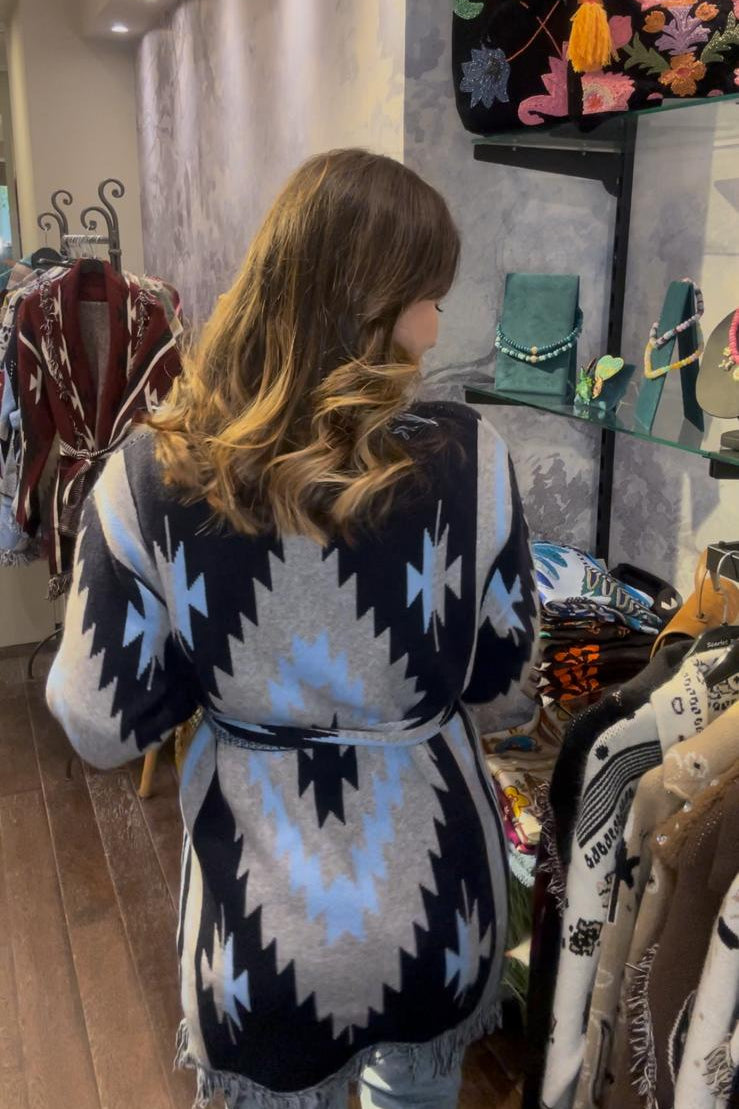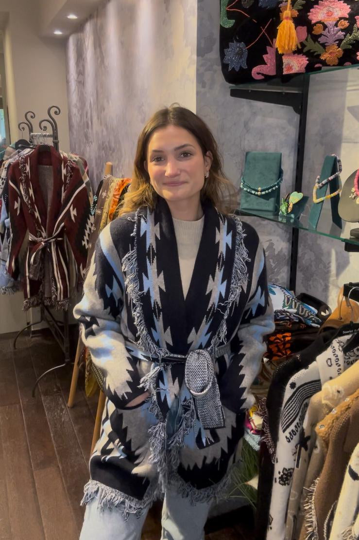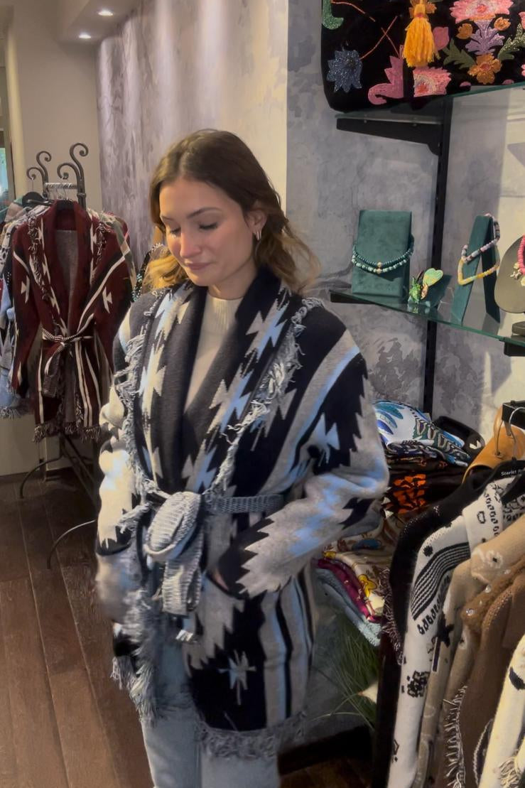 Fringed & belted jacquard cardigan