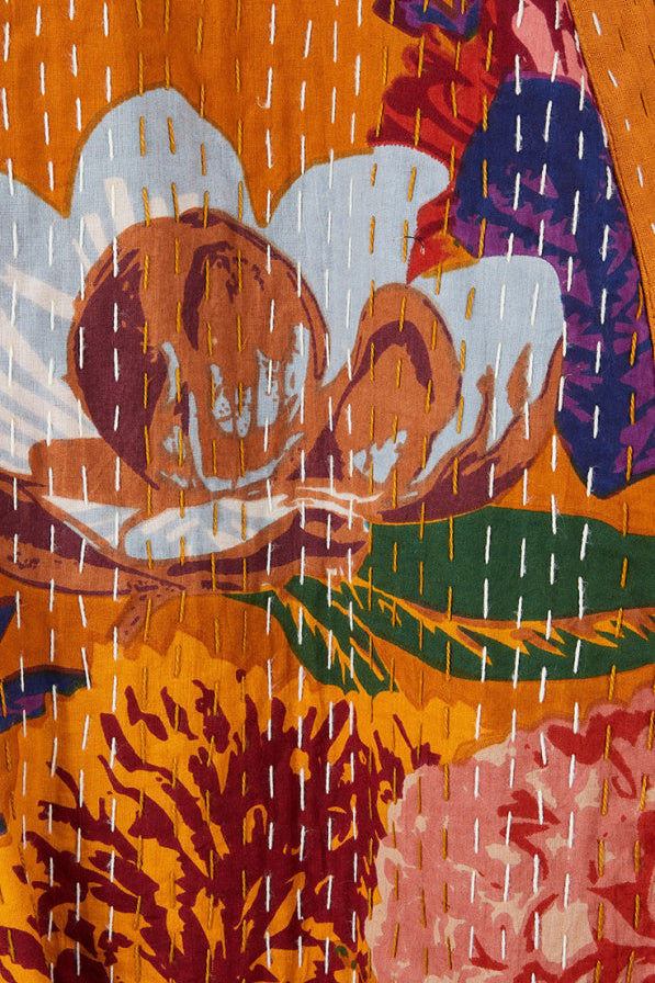 Long and beautifully ample, TOMMY can be worn open for a chic, nonchalant look, or belted at the waist for a more sophisticated silhouette. Available in two colors, it is revealed in yellow in a sumptuous floral version: an ochre background sublimated by hand-embroidered flowers in shades of pink, white, red, green, violet and blue, structured by delicate lines of white thread. A unique piece of craftsmanship straight from India.